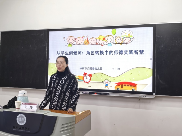 20251015日下午东校区求真楼111教室,特别邀请到在教育领域有着丰富经验和深刻见解的徐州市公园巷幼儿园德育主任王玲老师,为我院师生做了题为“从学生到教师:角色转换中的师德实践智慧”的精彩讲座。讲座由李冬香学术副院长主持,60多位师生聆听讲座,他们当中既有对未来教师职业充满憧憬的师范专业学生,也有不断探索与成长的青年教师。