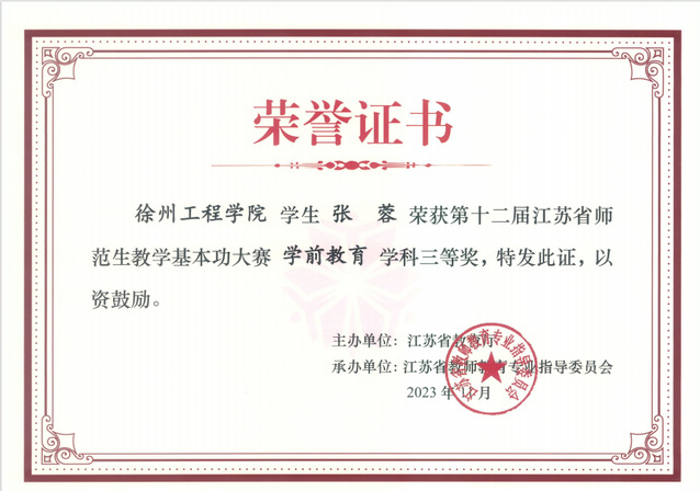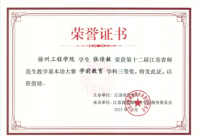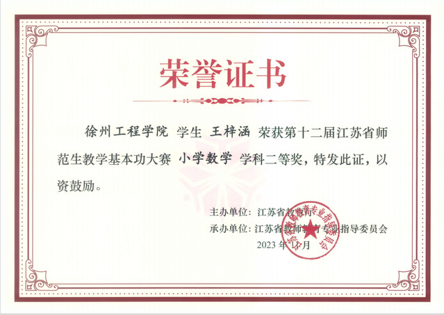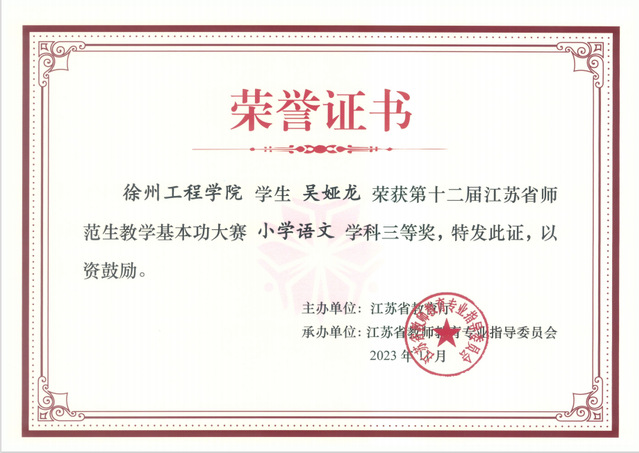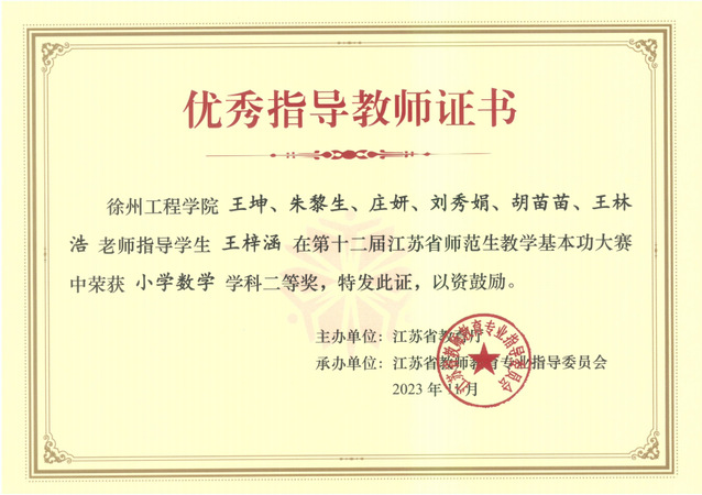 由省教育厅主办、江苏省教师教育专业指导委员会承办的第十二届江苏省师范生教学基本功大赛已经圆满结束,经过激烈角逐,我院2020级王梓涵同学获得小学数学学科二等奖、吴娅龙同学获得小学语文学科三等奖、张佳敏和张蓉同学获得学前教育学科三等奖,王坤、朱黎生、庄妍、刘秀娟、胡苗苗和王林浩获得了优秀指导教师的荣誉证书。