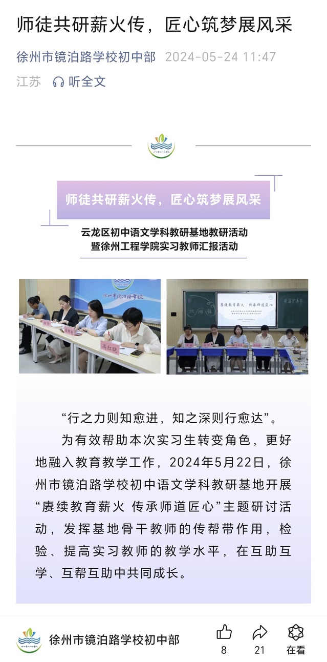 作为从“师范生”向“实习教师”的身份转换,在实习导师引领、指导下,同学们积极思考把专业理论知识融会贯通到中学语文教学、中学班级管理中去,通过接触到的多种不同课型、课堂教学秩序的管理、师生的交流等,不断反思自己的教学行为和效果,反思和总结经验,不断提高自己的教学技能和教育理念,锻炼自己的沟通能力和组织能力。其中,在镜泊路学校初中语文学科教研基地还开展了“赓续教育薪火 传承师道匠心”的主题研讨活动,通过实习教师与带教老师同课异构课堂教学、评课交流等主题活动,检验、提高实习教师的教学水平,也发挥基地骨干教师的传帮带作用,营造互助互学的浓郁教学氛围,效果显著。